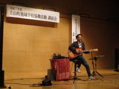 2月25日(水)立山町防災児童館複合施設「アカリエ」において、立山町地域学校協働活動講演会を開催しました。昨年、発展的解消をした「地域ぐるみ教育研究会」における講演会を引き継ぎ、「立山町地域学校協働本部」として初めて開催する講演会となりました。講師はフォークグループ「楽屋姫」のリーダーとして活躍しておられる岩谷英樹さんをお迎えしました。岩谷さんは、東日本大震災の被災地での演奏をきっかけに被災地応援コンサートやチャリティーコンサートを行っておられます。今回は、シンガー英樹トーク&ライブ「私の子供たちへ」と題して、トークとライブを通して、親として、大人として、子供たちに何を残すことができるのかについて伝えてくださいました。素敵なお話と演奏の連続で会場に集まった方々の中に感動の渦が広がりました。
